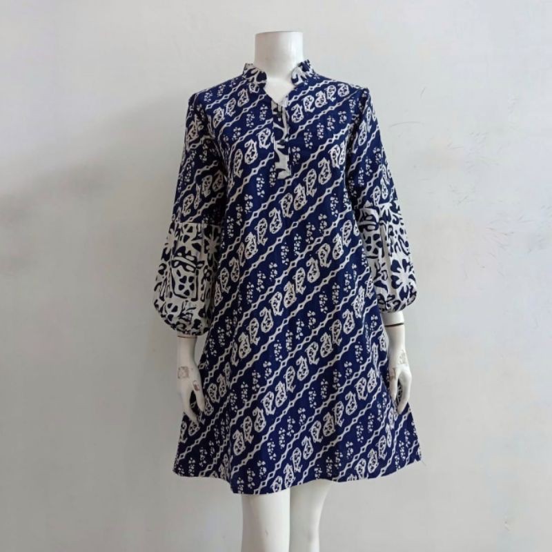 Paling Murah Pakaian W di Kabupaten Mukomuko Tunik Batik Solo Sanaya Lengan Balon 2 Motif Biru Navy Putih Seragam Dress Kerja dari Blousebatikwanita Kab. Sukoharjo